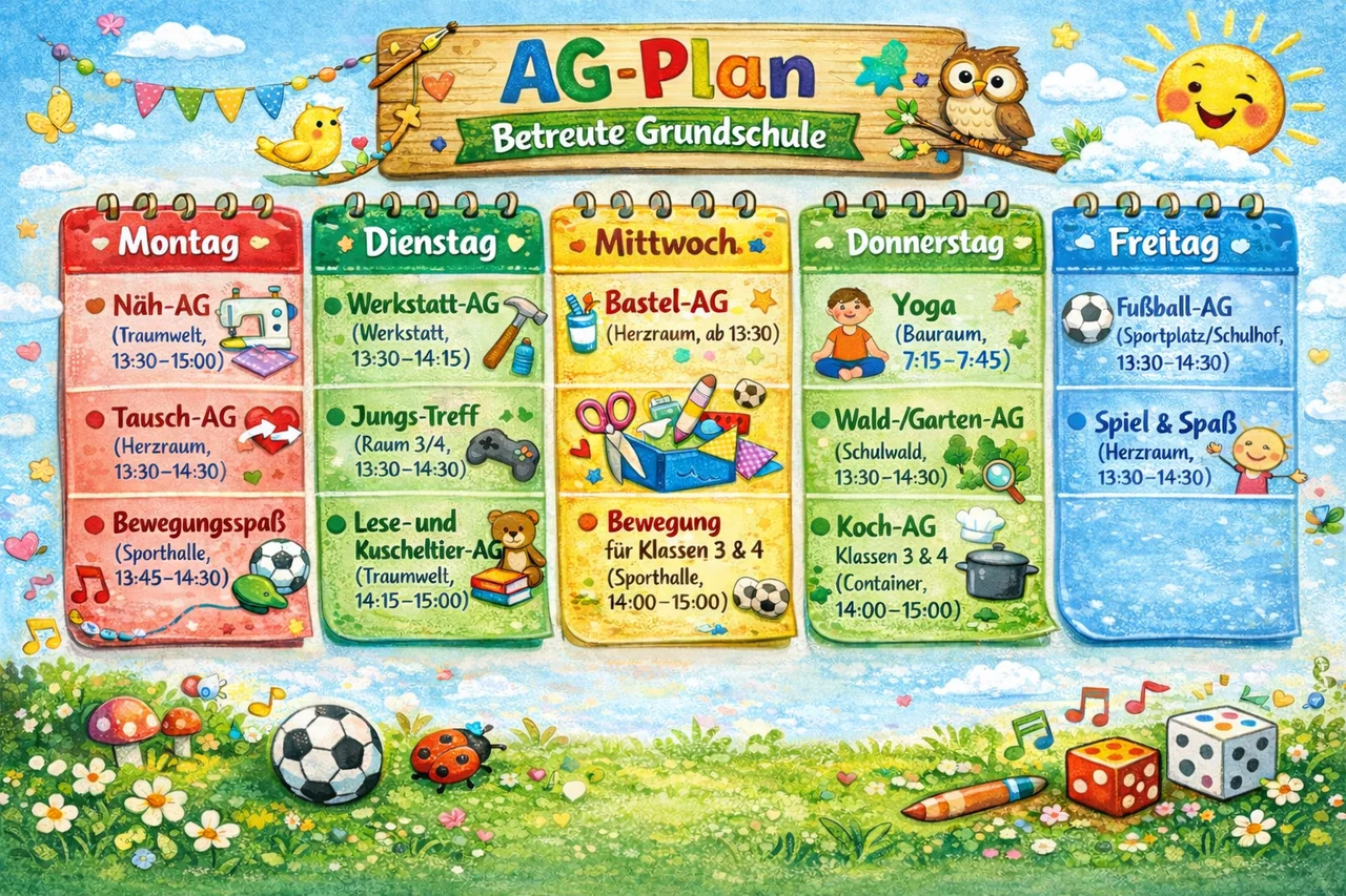 Arbeitsgemeinschaften (AGs)stellen einen wichtigen Bestandteil des pädagogischen Angebots an unserer betreuten Grundschule dar. Sie erweitern den regulären Unterricht um vielfältige Lern, und Erfahrungsräume, in denen Kinder ihre Interessen erkunden, neue Fähigkeiten entwickeln und soziale Kompetenzen stärken können. Durch die Verbindung von Bildung, Bewegung, Kreativität und Gemeinschaftsbildung tragen AGs entscheidend dazu bei, den Tag abwechslungsreich zu gestalten und Kindern individuelle Entwicklungswege zu eröffnen.